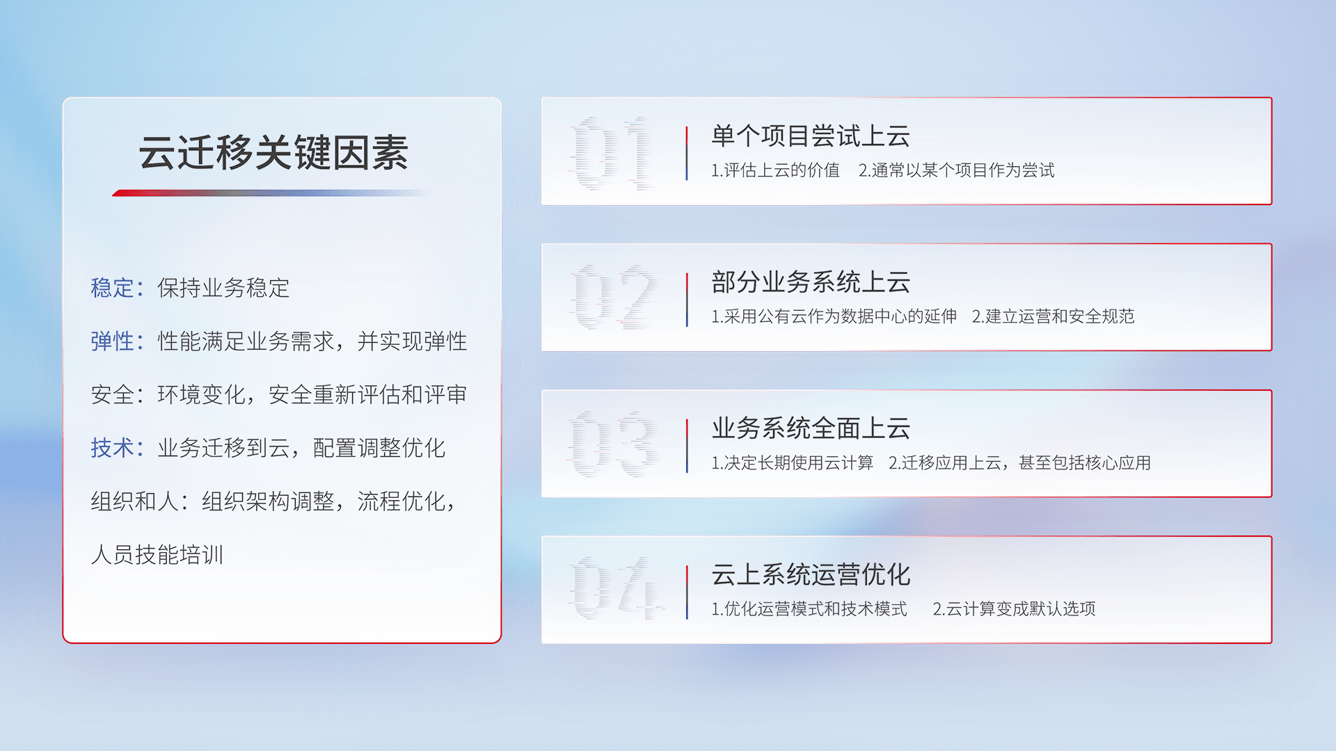 结合实际业务,,,,从规划设计、、、、云平台选型、、、云原生改造、、数据迁移、、、集成交付,,,,迁移全过程为客户识别最佳上云路径,,做好风险识别管理,,,,设计网络架构、、、身份权限、、、安全审计合规、、、操作审计、、日志审计、、监控告警策略、、、、多站点容灾设计等,,,,对云上基础设施进行整体规划,,提升IT治理水平,,,,以满足弹性、、、高可用、、、高性能的需求。。
