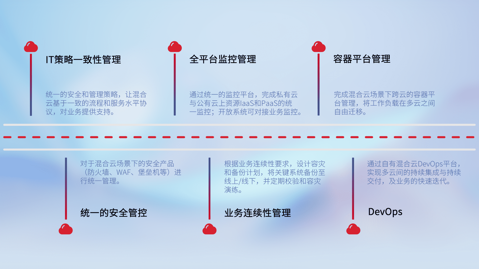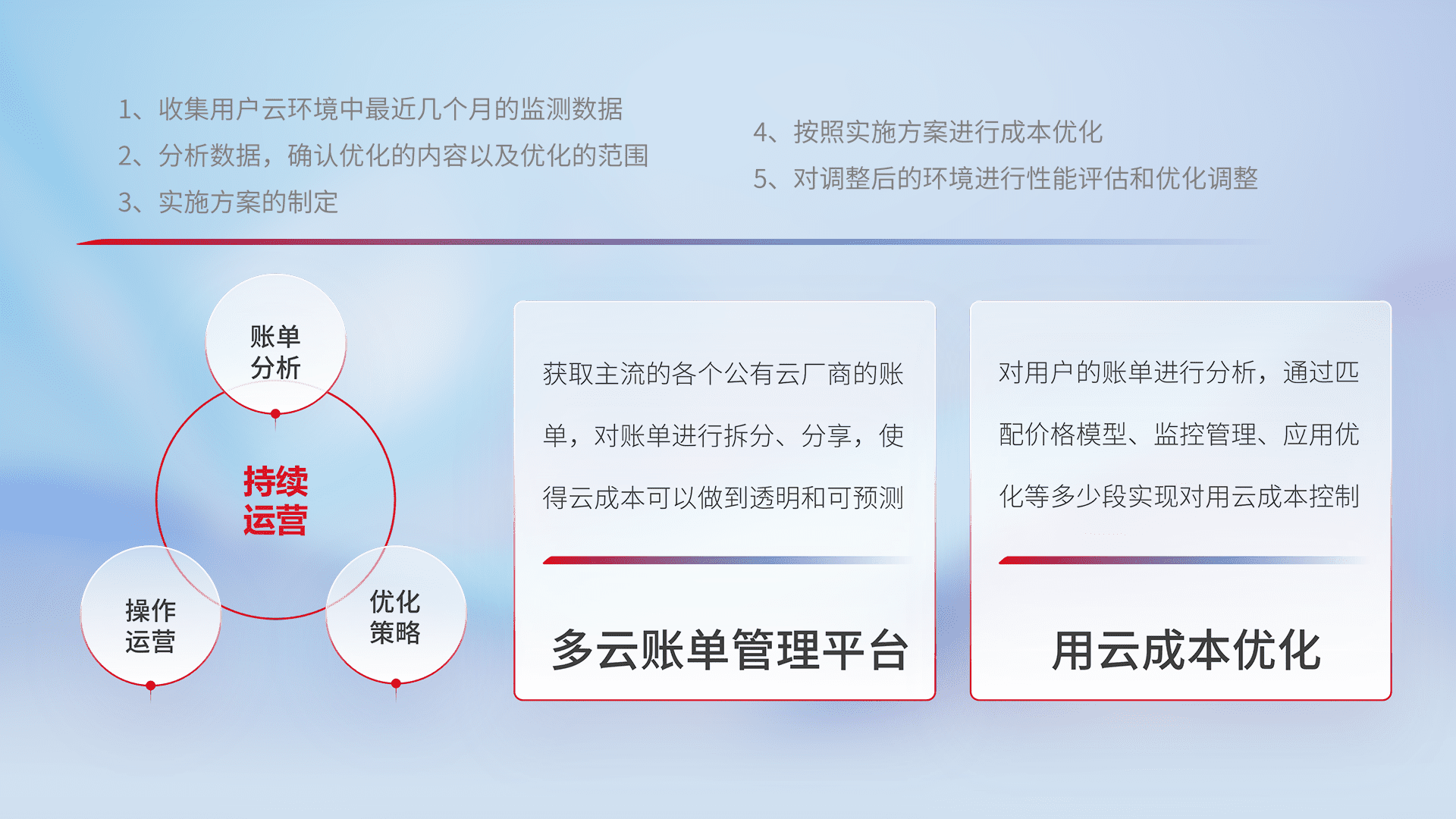 通过多云纳管,,,,以统一的资源数据模型把客户的云资源进行抽象和封装,,,进而实现对多云资源的统一操作,,保障云资源管理的可靠性、、稳定性与可用性。。。。量身定制化运维内容,,,配置、、、、开发运维、、补丁管理、、、、备份、、、监控、、认证和访问管理、、、审计和日常巡检等,,,保障在用云过程中的可靠度,,稳定度以及高可用率。。。