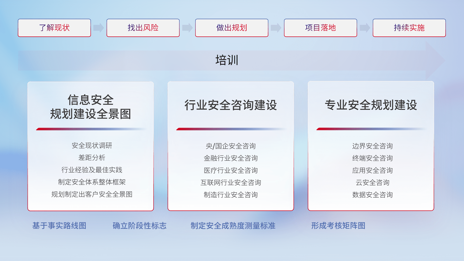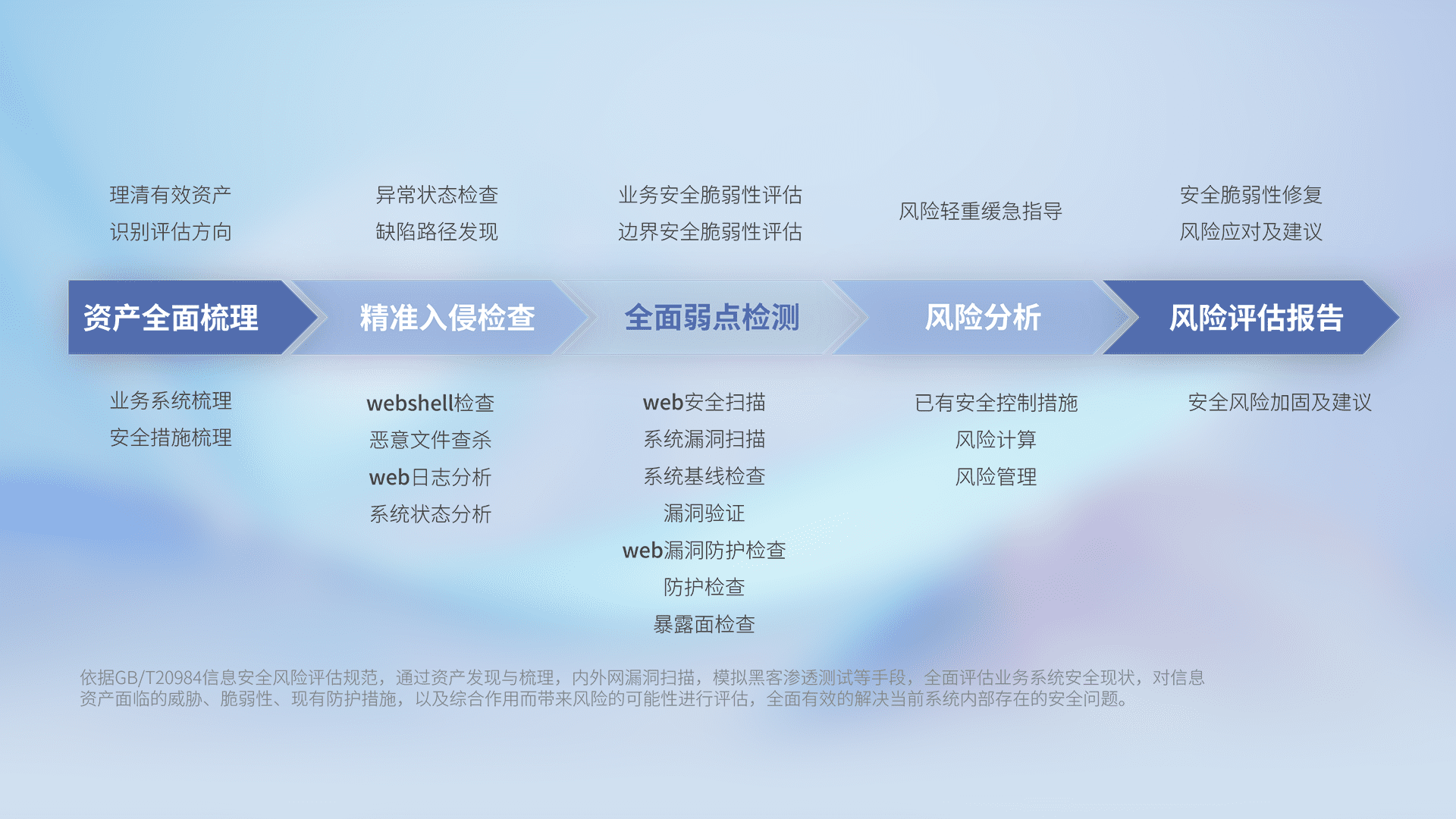 针对客户行业特性,,,以专业的安全服务+多厂商联合解决方案提供专属的一站式安全管理服务,,,帮助客户全面感知网络空间威胁,,,基于识别、、检测、、、分析、、、防护、、监测、、、响应的服务理论模型,,,,从方案咨询、、集成交付、、评估验证、、、优化加固、、运维运营,,,,致力于为客户提供完整的闭环管理式安全服务。。以实战经验为客户打造高抵御风险的安全体系,,帮助客户发现威胁、、、对抗威胁、、、处置威胁,,,,不断积累安全对抗能力,,,持续保障数字化安全。。